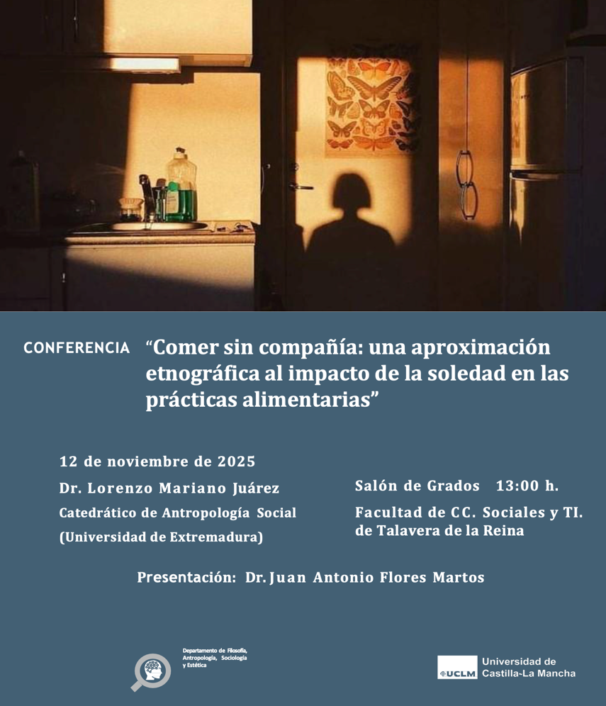 El profesor Lorenzo Mariano Juárez, investigador del proyecto Soledad, Envejecimiento y Alimentación. Cultura y etnografías contemporáneas”, ofreció el pasado miércoles 12 de noviembre la conferencia “Comer sin compañía: una aproximación etnográfica al impacto de la soledad en las prácticas alimentarias”, dentro del marco de Conferencias Plenarias del Departamento de Antropología de la Universidad de Castilla La Mancha.